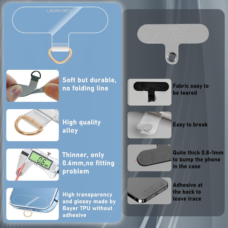 • TPU material: this cell phone lanyard pad is made of high quality soft TPU material. It is super clear, sturdy, thinner, wear resistant and durable, not easy to break like other nylon patch or PVC pacth. This phone lanyard patch can be used for long time. And this cell phone lanyard patch tab is designed without adhesive, so you don't have to worry about the glue after removal.