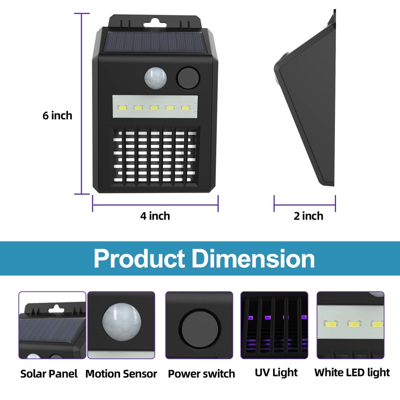 • Advanced 2-IN-1 Solar Bug Zapper: Not only does it serve as a high-efficiency mosquito killer, but it also functions as a solar motion sensor light for outdoor use. This dual-purpose device is designed to eliminate pesky bugs while simultaneously providing outdoor lighting. It attracts and kills mosquitoes and other flying insects using UV light, and it provides a bright white LED light for enhanced outdoor safety and visibility.