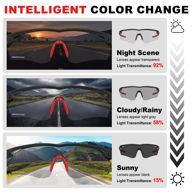 • Smart colour changing: the lenses of photochromic sunglasses can automatically change their colour depending on the intensity of UV radiation. The UV400 material can block 99.99% of ultraviolet rays, effectively preventing long-term eye damage