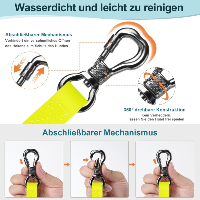 - Improved lockable carabiner: Our beautiful metal carabiner in the shape of a bone is praised by pet owners from all over the world. This is because it not only withstands a pulling force of 200 kg, but also has an additional lockable mechanism. The lockable design prevents your dog from accidentally opening the carabiner and getting out of your eyes. The carabiner can be rotated 360° so your dog can sniff freely.