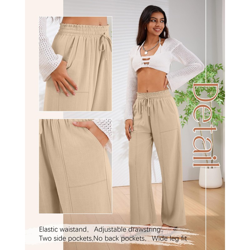 Xaatren 2 Pack Women's Linen Pants Summer Wide Leg Drawstring Elastic Waist Pant Casual Loose Fit Beach Trousers with Pockets(Khaki, Black,Large)