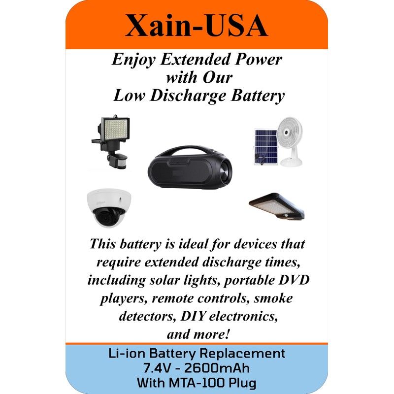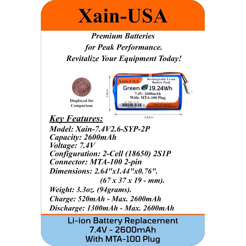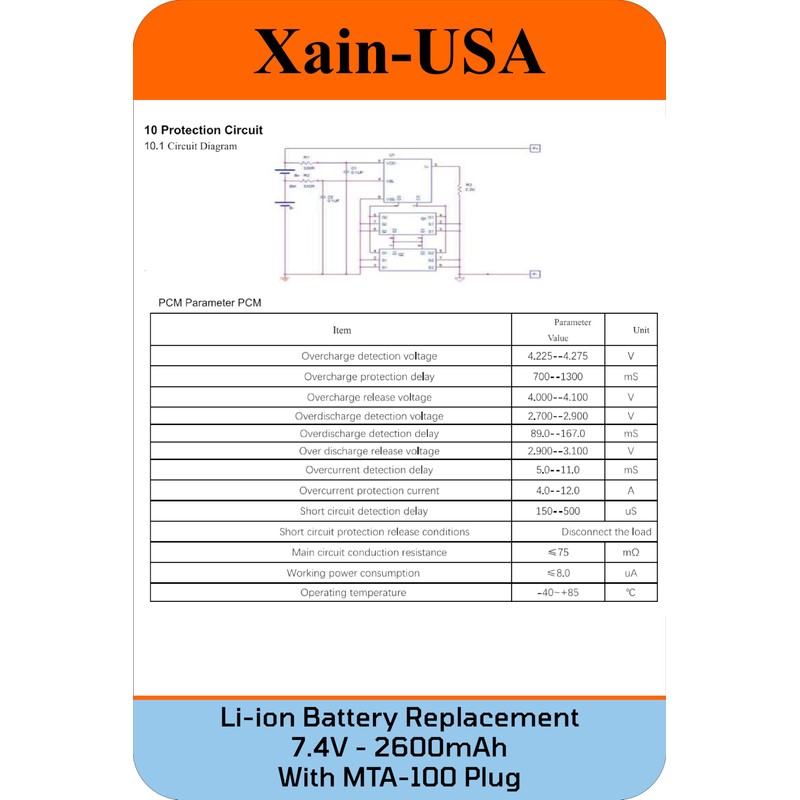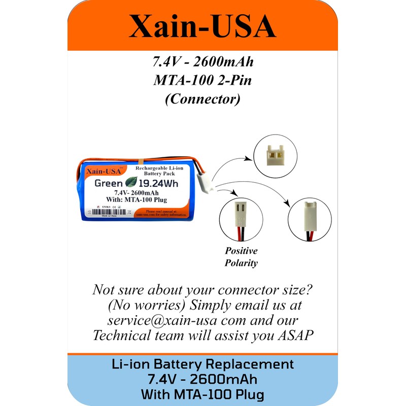 Xain-USA 7.4V 2600mAh 2S1P Li-ion Battery Pack with MTA-100 Plug and Integrated Battery Management System (BMS), Ideal for DIY Projects and Various Electronic Applications.