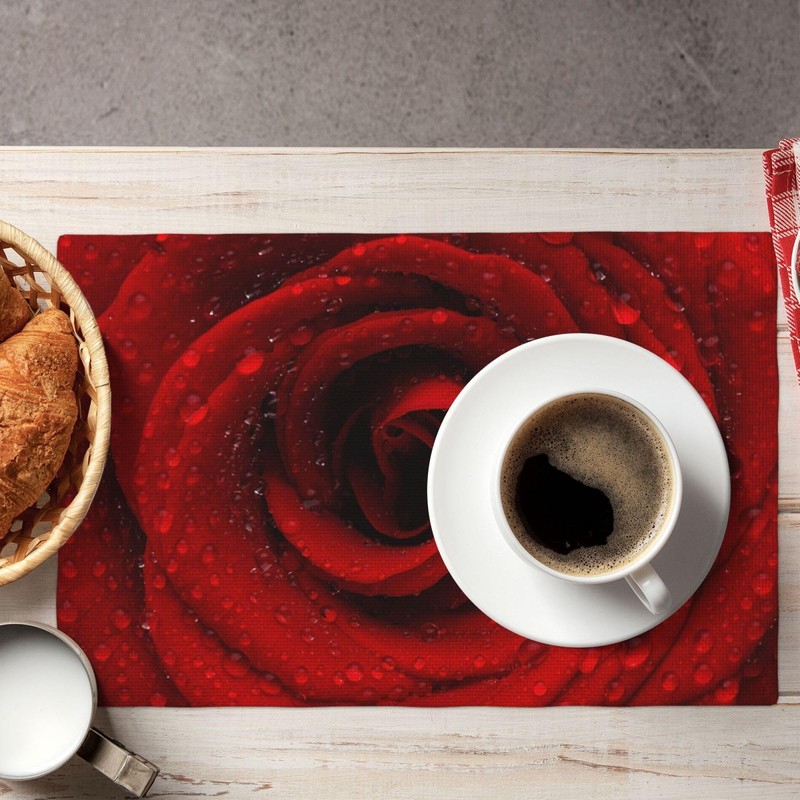 - Present: Our beautiful rose dining table mat with unique pattern print. These red cloth plate mats with big rose patterns are colorful and clear, a Valentine's Day or wedding ornament and a present for lover