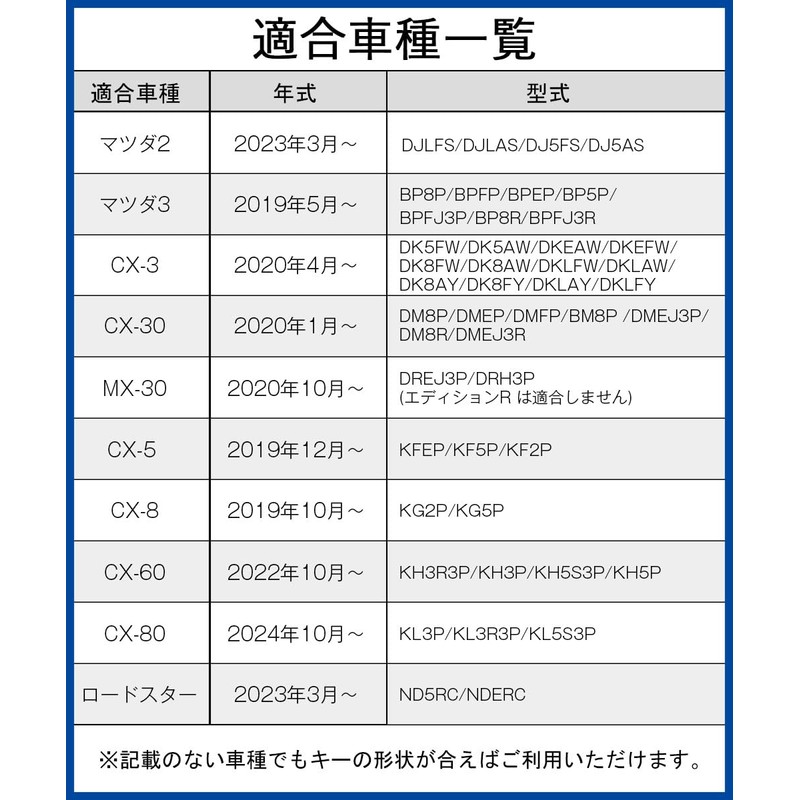 - Fits: Mazda Key Case 2 (From March 2023) Model: DJLFS DJLAS DJ5FS DJ5AS Mazda 3 (May 2019) Model: BP8P BPFP BPEP BP5P BPFJ3P BP8R BPFJ3R CX-3 (From April 2020) Model: DK5FW DK5AW DKEAW DKEFW DK8FW DK8AW DKLFW DKLAW DK8AY DK8FY DKLAY DKLFY CX-30 (January 2020) Model: DM8P DMEP DMFP BM8P DMEJ3P DM8R DMEJ3R MX-30 (From October 2020) Model: DREJ3P DRH3P (Not Fit Edition R) CX-5 (December 2019) Model: KFEP KF5P KF2P CX-8 (From October 2019) Model: KG2P KG5P CX-60 (From October 2022) Model: KH3R3P KH3P KH5S3P KH5P CX-80 (From October 2024) Model: KL3P/KL3R3P/KL5S3P Roadster (From March 2023) Model: ND5RC NDERC Even if the shape of the key matches the shape of the key even if it is not listed