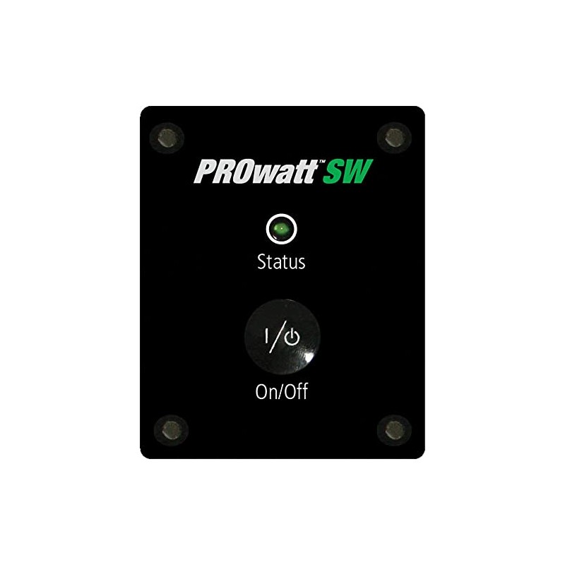 The Prowatt SW remote provides the convenience of a simple on/off remote function to the user. It also has an automatic ignition lockout feature to shut down the inverter's output when the vehicle's ignition or a 12 VDC enable is not engaged. A 25' remote cable is included with the remote panel.