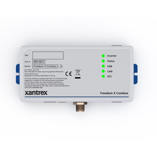 The FREEDOM X Combox for marine use connects the FREEDOM X and XC families of inverter/chargers to an RV-C or NMEA2000 bus to support seamless integration with third party monitoring and control systems.