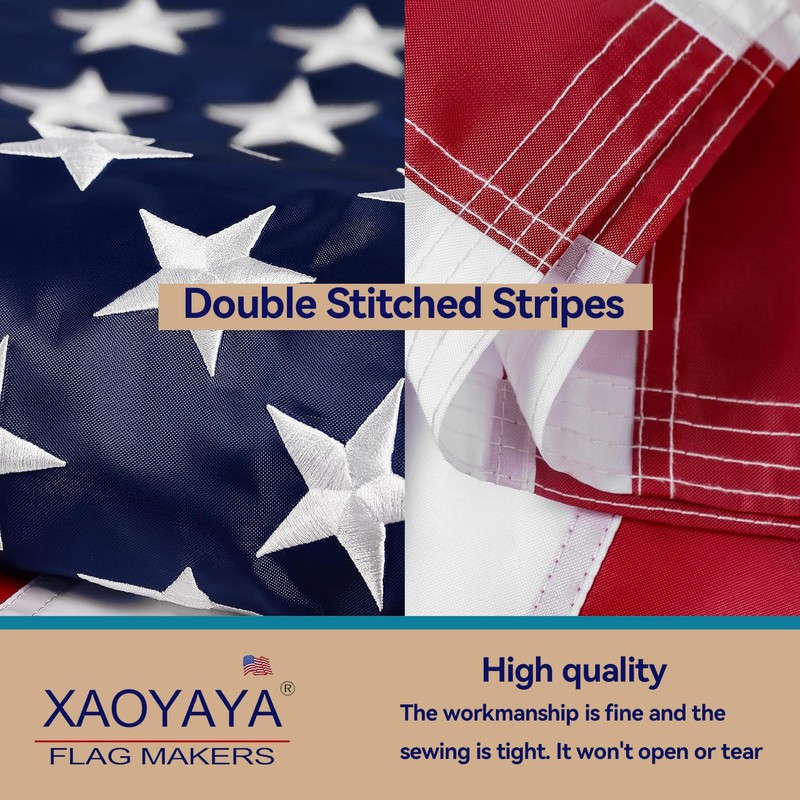 - High quality American flag: Our 3x5 Ft American Flag Is Made Of Heavyweight Nylon To It Is Supported By 2 Strong Brass Grommets,Every Star Is Densely Embroidered As Official US Flag Without Any Loosing Stitch, Each Stripe Is Stitched Together With Double-Needle Lockstitch And Four Rows Of Stitches On The Fly Hem To Resist Wind,Ensure That Each Flag Can Survive The Harsh Weather,This American Flag Will Always Be In Good Condition.