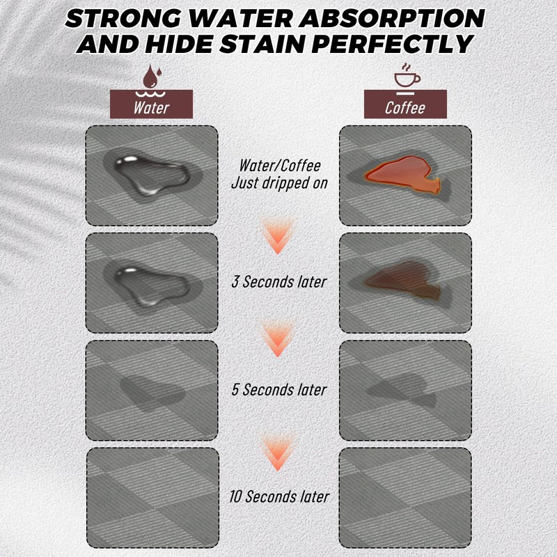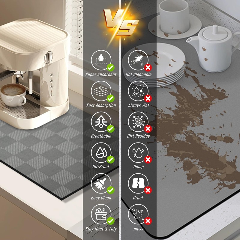 - 【Coffee Mat For Countertops】This coffee bar mat is made of PU material and diatomaceous earth has extremely stain-resistant. Use the Coffee mat to prevent coffee stains, milk stains, and any other dark, dirty stains. Make delicious coffee, leaving no stains! In addition, the coffee bar mat is thick enough to better protect countertops, cups, tableware and glassware from damage and pollution.