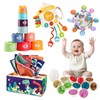 - 5-in-1 sensory toy set: the sensory baby toy contains 5 fun educational toys: stacking toy blocks, dinosaur matching eggs, stacking cups, tissue box, grab ball and pull cord toy. The colours are bright, and it is an early education toy suitable for children aged 6-18 months.