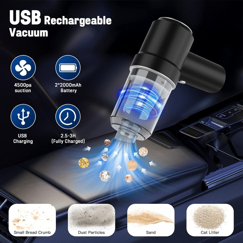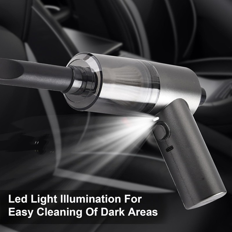 - 【2 In 1 Handheld Vacuum5 Accessories Available】An extended nozzle is suitable for cleaning desks, doors, windows, cars, and sofa corners; A brush is suitable for sucking and wiping carpet, curtains, etc. 3 kinds of nozzles to choose from, to inflate/pump for small equipment The vacuum has a smart design, the front end can vacuum while the rear end can blow dust, which gives you efficiently cleaning experience. Our mini vacuum has suction up to 4500PA, which is enough to meet your cleaning needs for dust, pet hair and some difficult-to-clean debris in the car or home. The cordless vacuum also has an LED light, it allowing you to easily clean dark corners