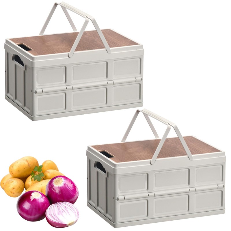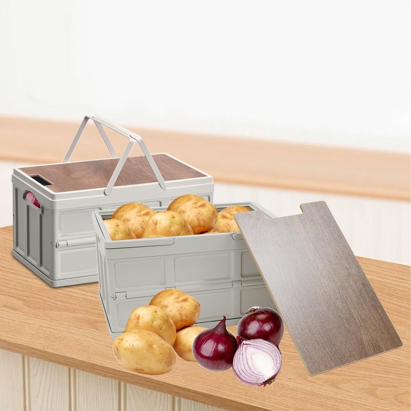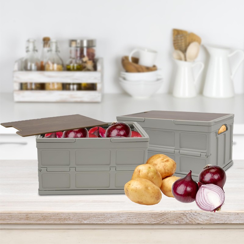 Xbopetda Kitchen Vegetable Storage Set of 2, Plastic Potato and Onion Storage Bin with Wooden Lid, Foldable Potato Bin Onion Keeper, Kitchen Pantry Organizers and Storage for Fruit Vegetable Produce