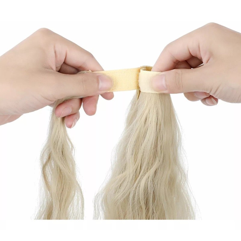 4. Asegure el velcro y continúe envolviendo la larga correa alrededor de la cola de caballo para cubrir la banda;