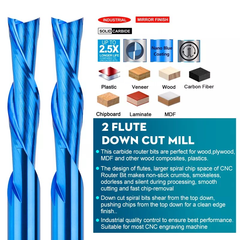 Material: Solid Tungsten carbide. Durable and sturdy and wear resistant. Downcut Bits Dimension: 1/4" Shank (6.35mm). Cutting edge diameter, 1/4" (6.35mm). Cutting edge length/flute length, 1 inch (25mm). Overall length, 2.95 inch ( 38mm) 5pcs Downcut Double Flute Spiral CNC Bit: Ideal For carving/cutting/engraving/milling/slotting/sculpturing in materials like MDF, ABS, PVC, acrylic, nylon, resin, plastics, density board, wood, plywood, hardwood etc. Widely used For CNC Engraving, Milling, Roughing, Hollowing, 3D sculpturing purposes Clean Cut & Excellent Edge-Grinding: The design of flutes, larger spiral chip space of CNC Router Bit makes non-stick crumbs, smokeless, odorless and silent during processing, smooth cutting and fast chip-removal High Quality: Industrial quality control to ensure best performance. Suitable for most CNC engraving machine | |