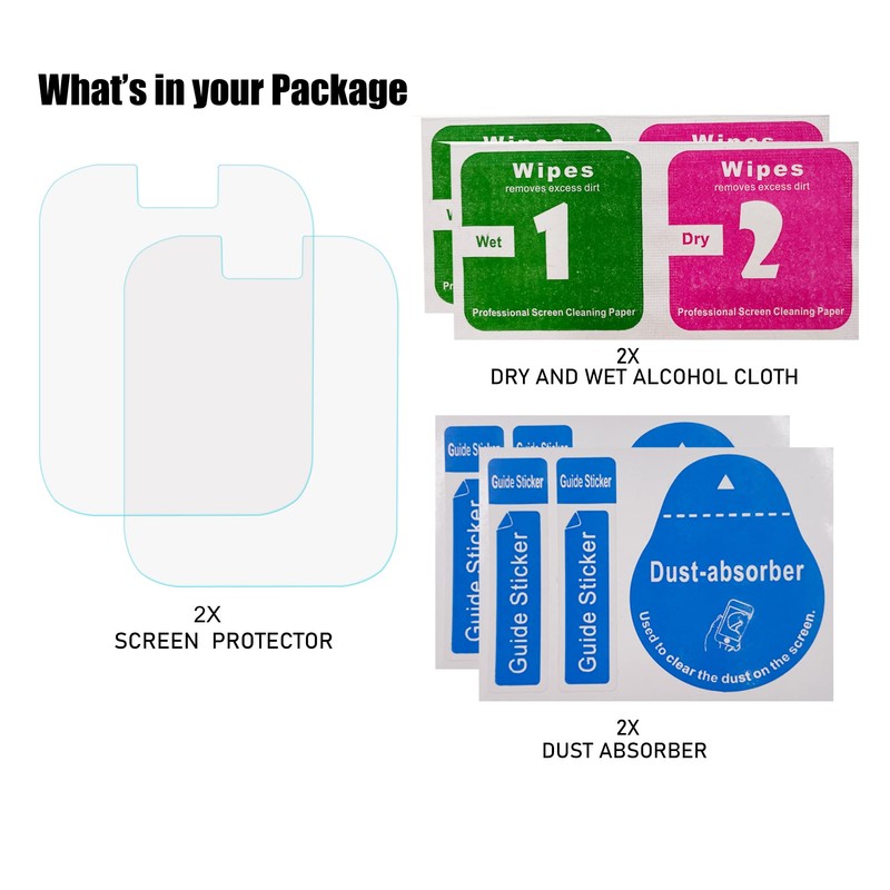 - 2 x Screen Protection Film;2 x Alcohol Prep Pad; 2 x Dust Absorber