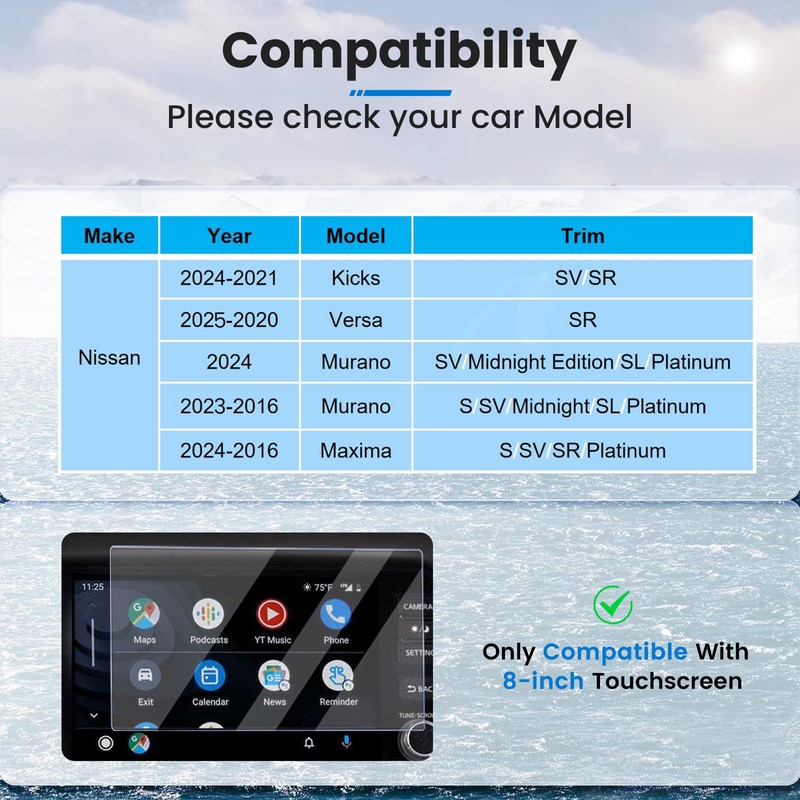 - COMPATIBLE WITH(2 PACK):2020 2021 2022 2023 2024 2025 Versa Screen Protector for Nissan Versa SR Screen Protector 8-In Custom-designed for 2020-2024 2025 Nissan Versa SR touchscreen display,for 2020-2024 2025 Nissan Versa SR Accessories