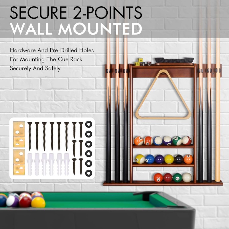 - 🎱【Wall Cue Rack】Using a mounted wall rack to hold your cues is a great way to store all your pool accessories without taking up valuable floor space and keep your game room neat and organized.