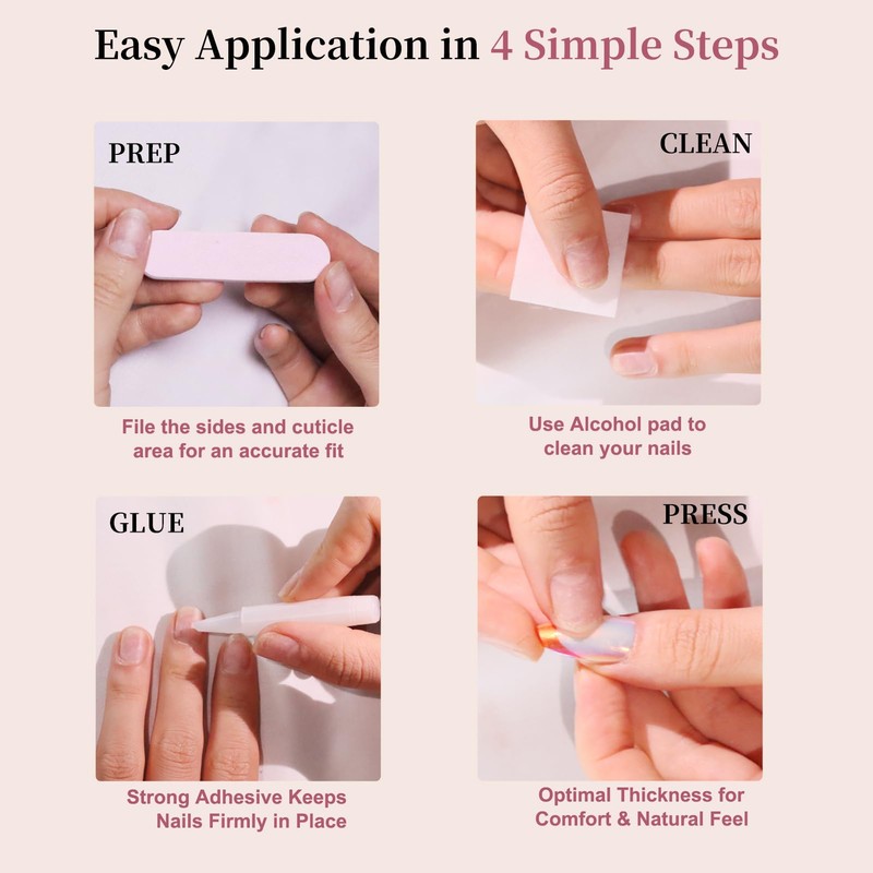 - Gentle Removal Soak hands in warm water for 10 minutes for easy removal. Gently lift the press-on nails from the side — no damage to natural nails.