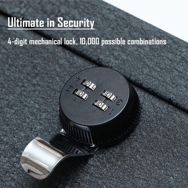 - [Textured Metal Material] This console gun vault is made of heavy 12 gauge cold rolled steel and has an anti-rust coating on the outside to prevent rust, so it has a very long service life. It comes with 4-Digit combo lock.