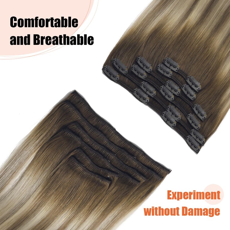 - Clip-In real hair extensions. Specification: 6 pieces with 18 clips per set, 14 inches and 16 inches 100 g with clips, 18 inches to 22 inches 120 g with clips, for a full head, we recommend 2-3 sets