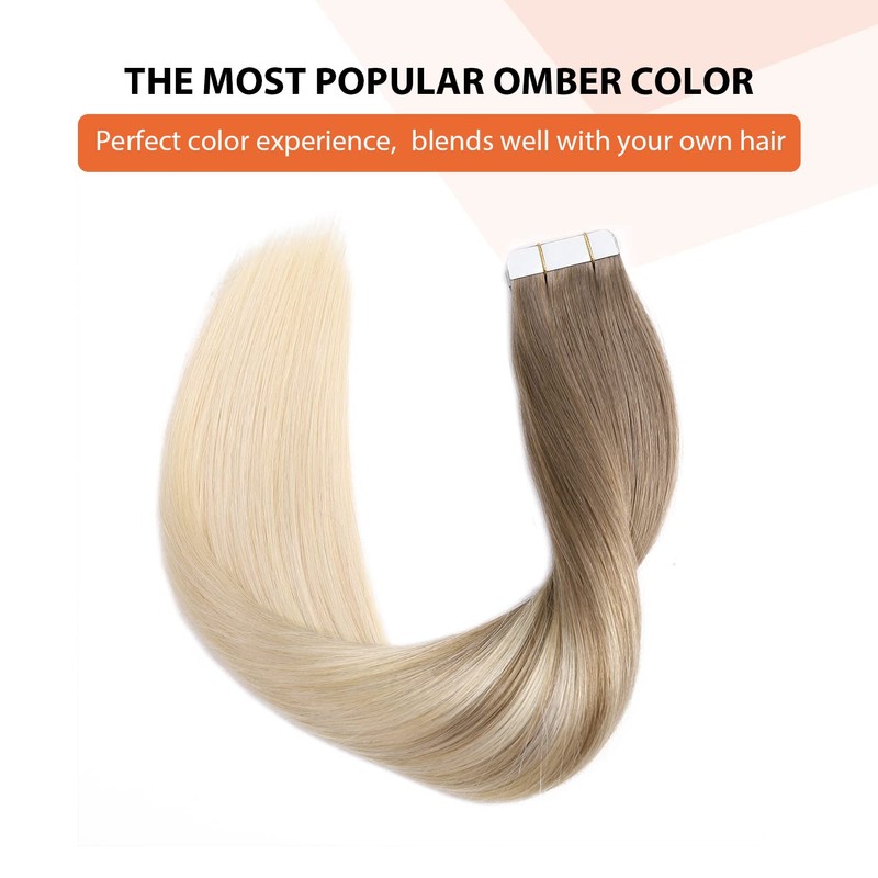 XDhair Tape Extensions, Real Hair, Ash Brown to Platinum Blonde, 20 Pieces, 50 g, 40 cm, Remy Real Hair Extensions, Silky Straight, Skin Weft Tape Ins (#8T/60-16)