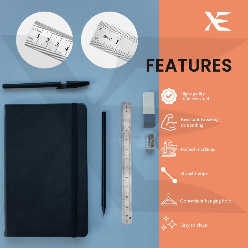 XE Stainless Steel Ruler Set – 12 (30 cm) and 6 (15 cm) Inch Precision Metal Ruler Set, Ideal Straight Edge Measuring Ruler for Students, Office, Engineers, Crafting, and Sewing with Hanging Hole