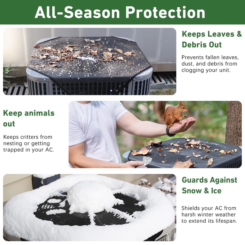 - Wind Resistant And Leaf Guard: Protected by rust-resistant elastic hooks, the ac unit covers will not move even in the face of strong winds. The ac cover is also good at blocking fallen leaves, branches, debris, grass and other things from being blown into the air conditioner, thereby extending the life of the air conditioner