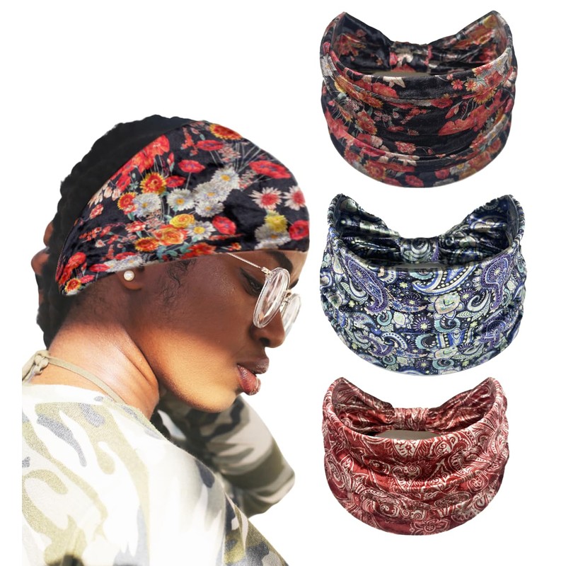 XEF Headbands for Women Bohemian Wide Floral Thick Hair Band No Slip Gym Elastic Twist Knot Athletic Headband Sweatbands Fashion Hair Accessories for Teen Girls