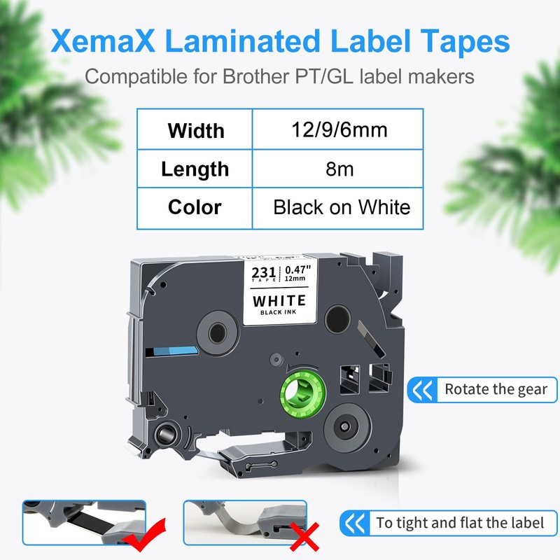 - Colour and contents: 1 x Tze-211, 1 x Tze-221, 1 x Tze-231, black on white, compatible with Brother P-touch laminated tapes. Width: 0.23 inches (6mm), 0.35-inches (9mm), 0.47-inches (12mm). Length: 26.2 feet (8 m).