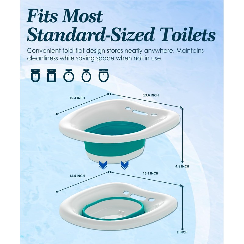 - COMPACT FOLDABLE STORAGE - Simple collapse design reduces space during storage.Collapses to 2-inch thickness for under-sink storage, 70% smaller than rigid sitz baths when folded and equipped with hooks for easy storage/drying.