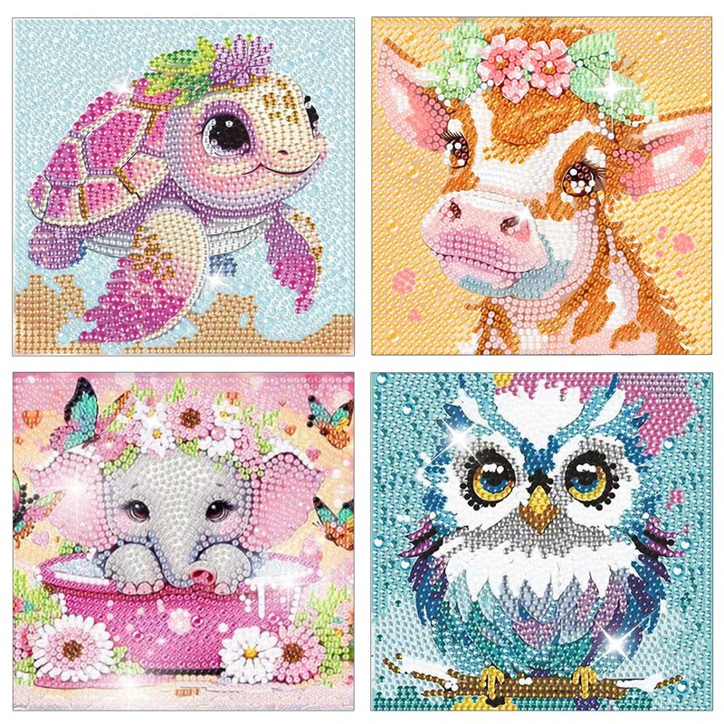 - Diamond Painting Set: you will receive a complete set of cute 5D animal themed diamond painting kits, including 4 cartoon diamond painting kits with different animal patterns, namely a small turtle, a cow, an owl and an elephant baby. The package contains several packs of coloured diamonds, 4 animal canvases, 4 point drill pens, 4 diamond trays and 4 tones with very rich accessories.
