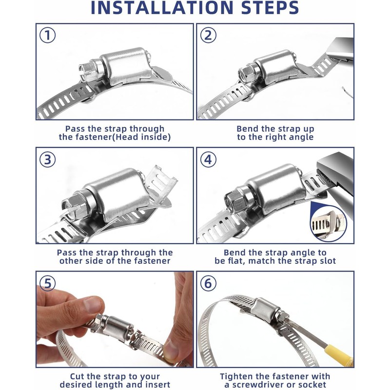 - Adjustable length: easily adjust our DIY hose clamps range to the desired length and ensure a perfect fit for different hoses. Say goodbye to size inconsistencies and enjoy effortless pipe repairs. Besides, it is easy to install in just 6 steps according to our instructions.