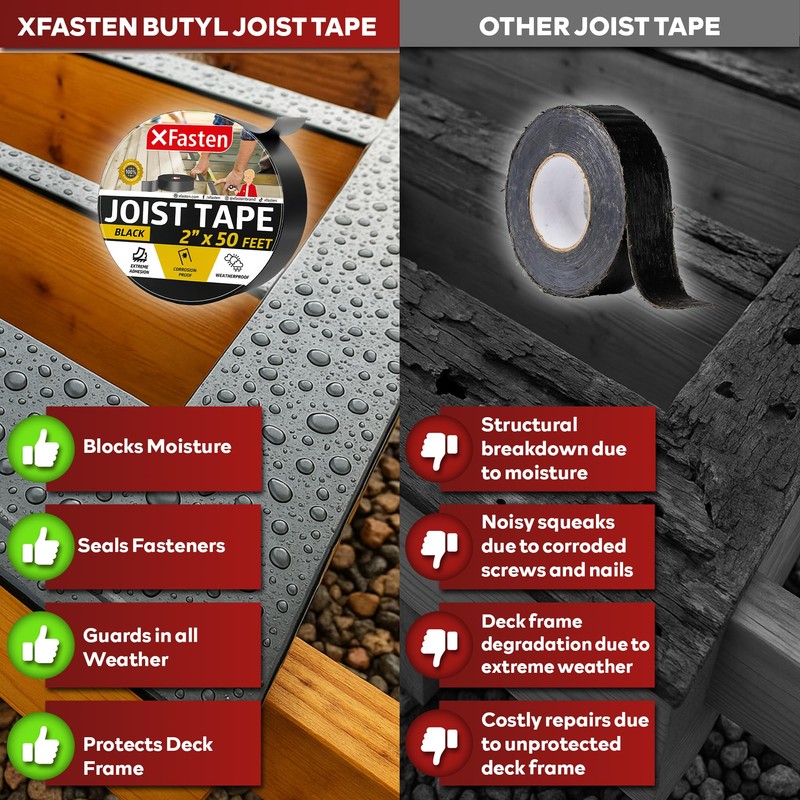 - LASTS A LIFETIME. Lasting up to 50 years, our butyl joist tape for decking 2 Inch safeguards against moisture, UV, steam, and high temps. ZERO-MAINTENANCE needed; our deck joist tape 2 inch extends the lifespan of beams, joists, and screw points.