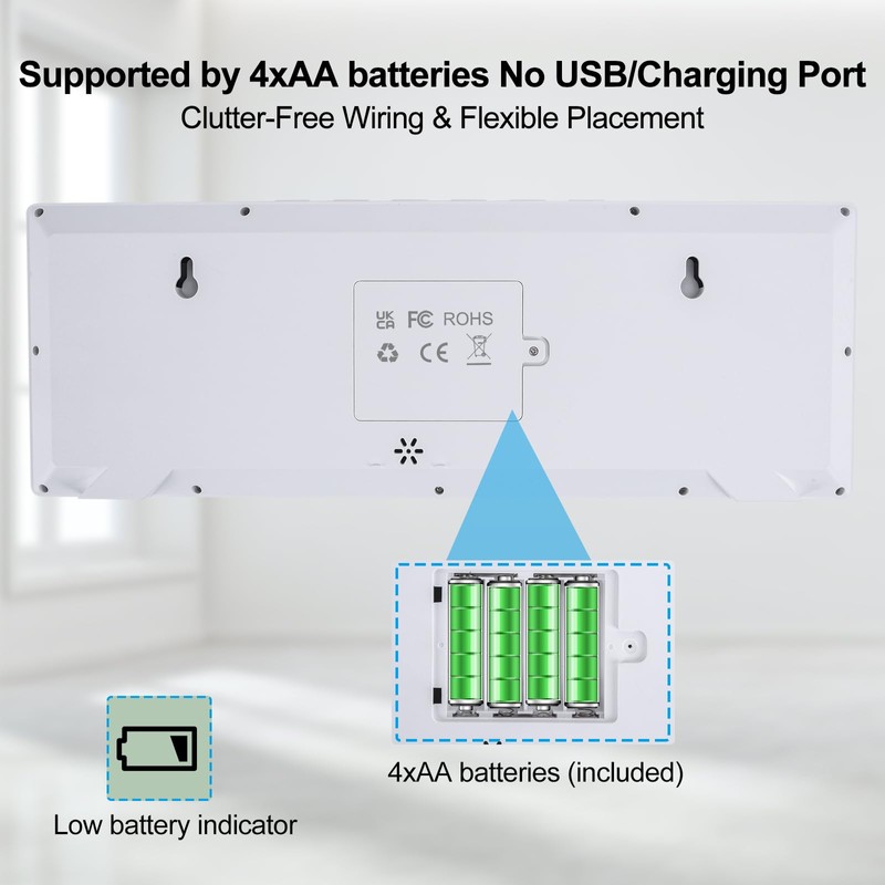 - Digital Clock Battery Operated - Operated by 4 included AA batteries (no messy cords), this digital wall clock large display offers flexible placement anywhere in your space while maintaining a clean aesthetic. A built-in low battery indicator eliminates guesswork for timely replacements.