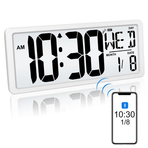 Xflyee Bluetooth Time Sync Digital Wall Clock Battery Operated with Backlight, Auto DST Large Digital Wall Clock with Day, Date & Temperature, 15'' Large Digital Clock for Home, Bedroom, Office