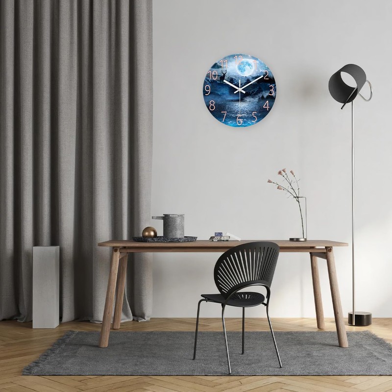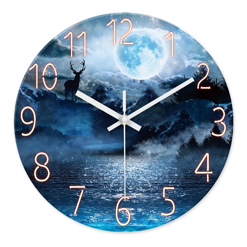 XFM Natural Landscape Analog Wall Clock Battery Operated 12 Inch - Moon Lake Glass Wall Clock for Living Room - Elk Blue Wall Clock Silent Non-Ticking