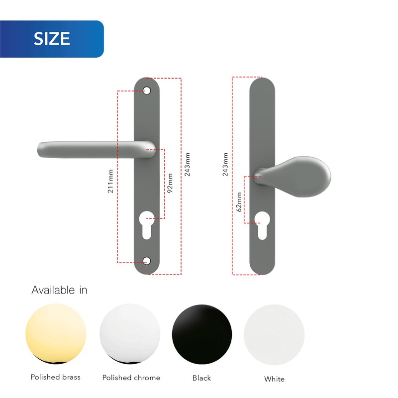- PRECISION FIT: Tailored for UPVC door handles, this offset lever/pad design has a PZ length of 62/92mm, a screw hole distance of 211mm, and an overall length of 243mm. The XFORT Uros exterior door handle includes matched screws for a seamless installation that looks sleek and professional on any UPVC or PVC front door.
