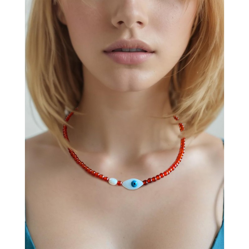 Xfoxstal Simple Crystals Beaded Necklaces for Women Freshwater Pearl and Shell Evil Eye Necklace Protection Good Luck Jewelry (Red Agate)