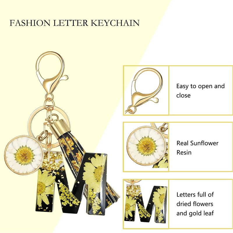 - Letter keychain : Initial letter keychain with tassel, Sunflower Pendant, Black and Yellow Sunflower Resin Letter. These keychains make a beautiful accessory. These keychains are easy to those hard to find keys, clip on a handbag or wallet.