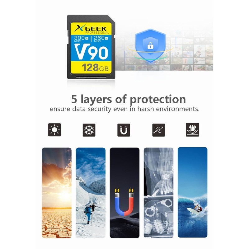 • **Durability and Reliability**: The XGEEK V90 SD card features attributes such as waterproof, shockproof, and high-temperature resistance, making it suitable for use in extreme environments. It is an ideal choice for outdoor adventures and critical event scenarios, ensuring data safety and long-term performance