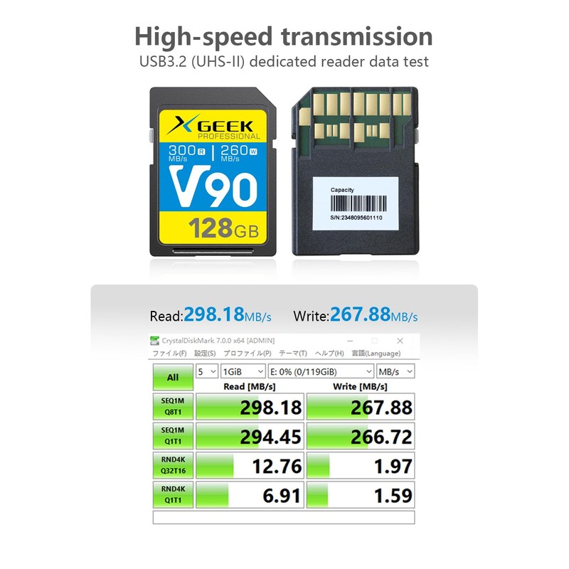 • **High-Speed Data Transfer**: The XGEEK V90 SD card combines advanced UHS-II technology with PSLC, providing exceptional data transfer speeds and stability with write speeds up to 260MB/s and read speeds up to 300MB/s. It is ideal for handling large volumes of 4K and 8K video data, ensuring that professional photographers and videographers capture every detail