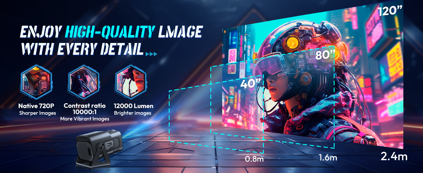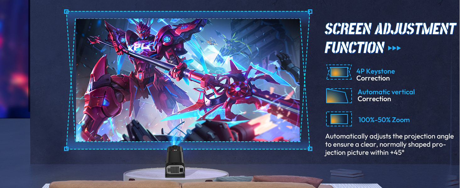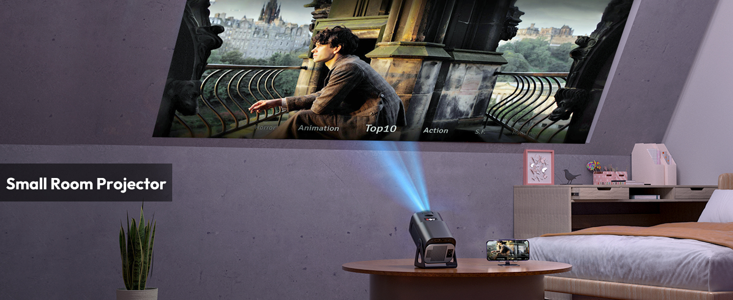 Our projector can display a larger image from the same projection distance, allowing you to enjoy a big-screen experience even in smaller rooms. Additionally, its versatile stand supports 180° rotation, enabling you to use any wall or ceiling as your screen. Whether sitting or lying down, in the living room or bedroom, you can comfortably immerse yourself in the viewing experience.