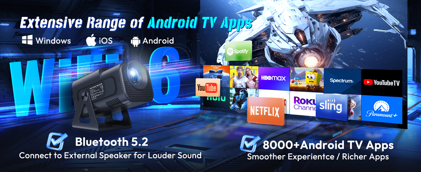 Smart Android projector Gimbal5 is embedded with Android 11.0 operating system pre-installed with Netflix, Youtube and other applications, and enjoy massive video resources through more than 8000+ applications. It has the latest 5G dual-band WiFi 6, bringing more High transfer rate and lower latency, Supports Eshare wireless mirroring function to easily share your smartphone content to the big screen.