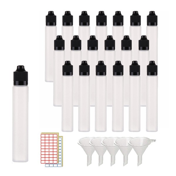 - 【Package Included】:20 pcs 2oz/60ml high quality empty refillable liquid plastic dropper bottles with 20pcs thin tips, 20pcs screw child resistant caps, 4pcs funnels, 1pcs lable.