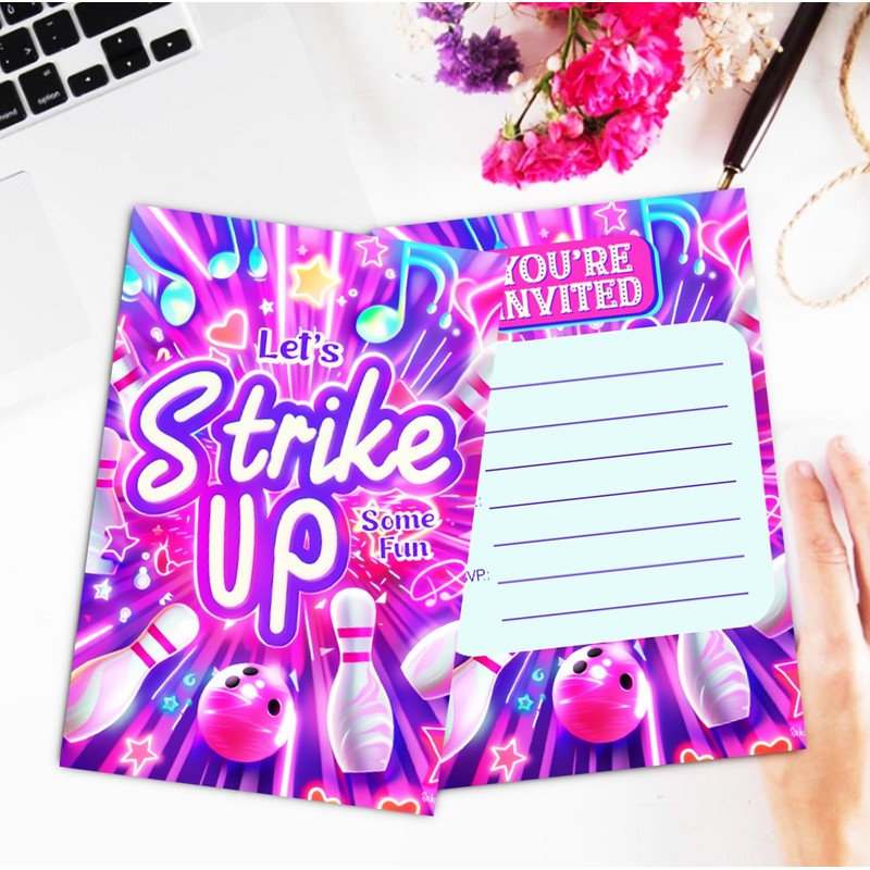 XIAOPNN Neon Bowling Birthday Party Invitation for Girls, Kids Birthday Party Supplies, Let's Strike Up, 30 Cards With 30 Envelopes