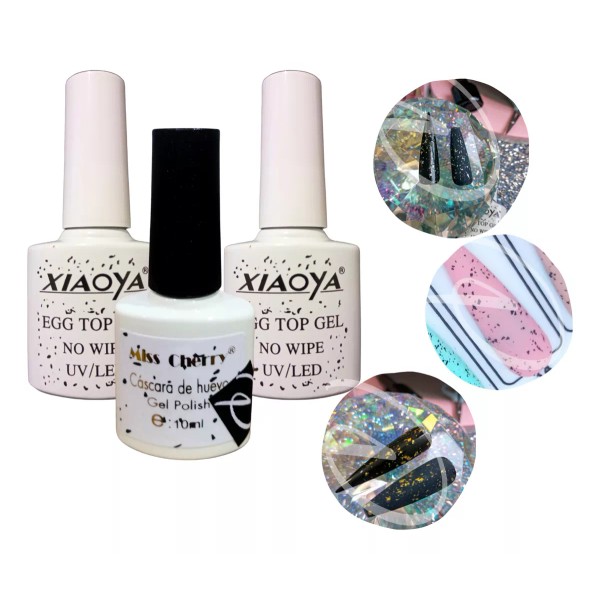 Kit de Top Coat para esmalte en gel semipermanente efecto Egg Huevo Codorniz | Kit de tres colores básicos Dorado, Plata y Negro | Marca Xiaoya y Miss Cherry | También puedes utilizarlo en | uñas acrílicas || polygel || gel sólido || press on || soft gel || Requiere lámpara UV LED para secado.