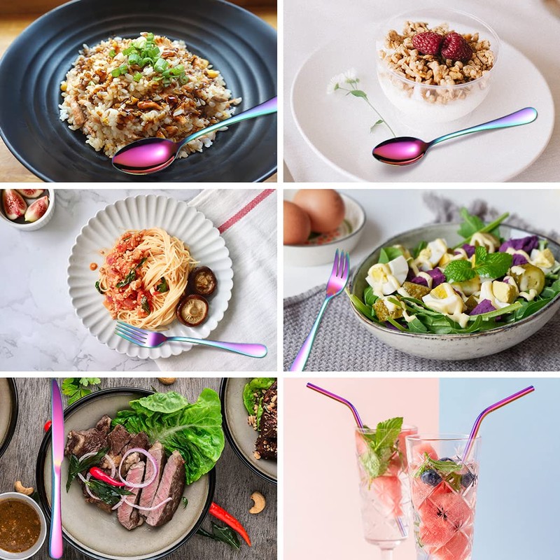 Reusable utensils is made of stainless steel with high quality plated which enhance the surface hardness,avoid the scrath on the flatware when using. Please note that the durable quality comes with the certain weight, durable and healthy for daily use, dishwasher safe,smooth edges without rough spots, anti-oxidation, stylish and generous. Mirror finished surface and ergonomic shape.