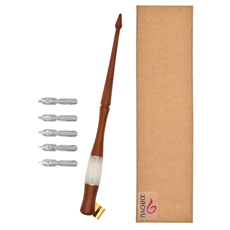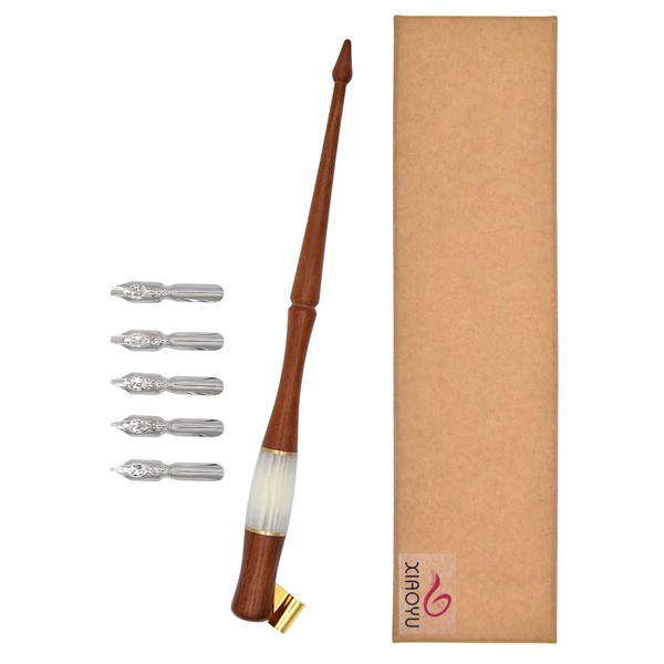 XIAOYU Oblique Wooden Pen Set, Calligraphy Set for Beginners, 5 Calligraphy Dip Pen Nibs, Brown