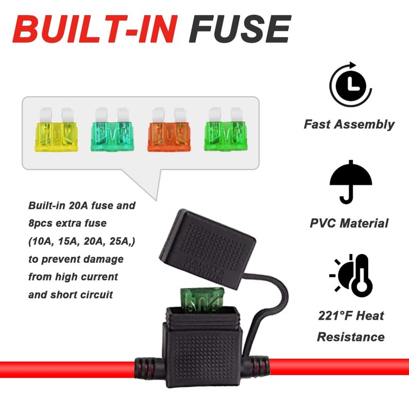 - [Built-in Fuse]: Equipped with extra fuse (15A 20A) for electrical protection. O-ring terminal inner diameter: 0.3 inch/8 mm, outer diameter: 0.6 inch/15 mm.