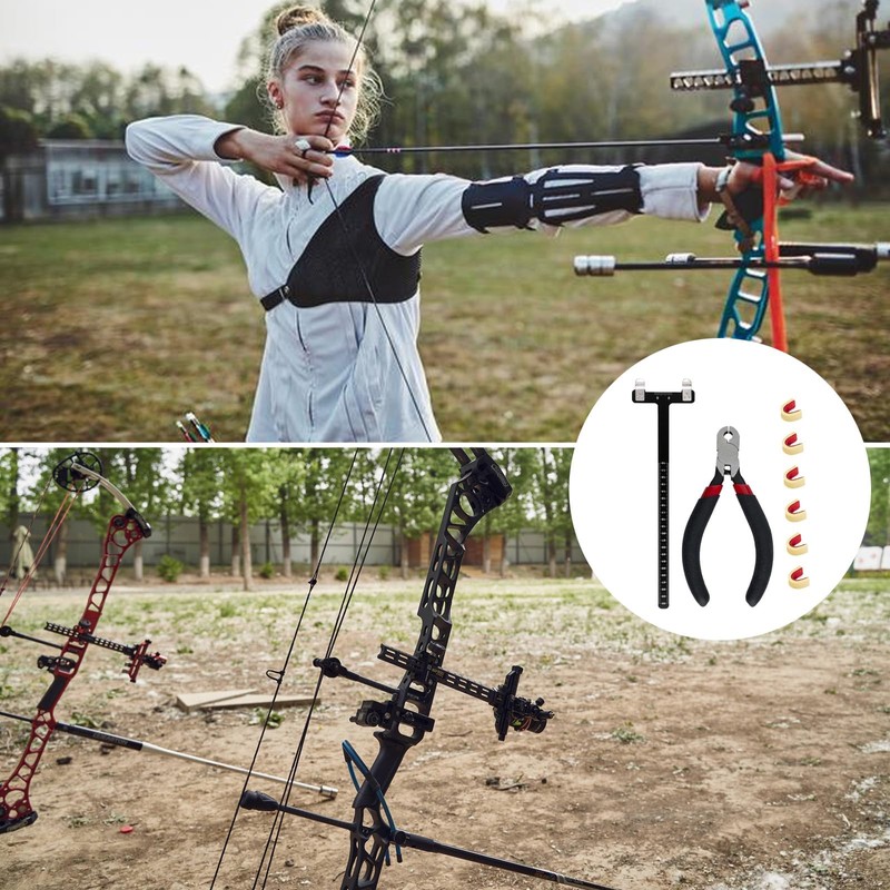 - Box contents: T-shape bow square ruler set includes 6 x cam points for the bow string, 1 x nock scoring pliers for archery, 1 x T-shape bow ruler, suitable for all sizes of cam points and clips without damaging the bow cord