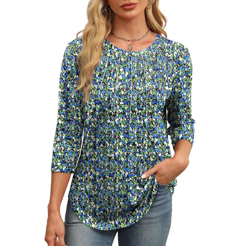 XIEERDUO Tunic Tops for Women Loose Fit Dressy Round Neck Pleated 3/4 Sleeve Tops 2025 Spring Tops Blue Floral XXL